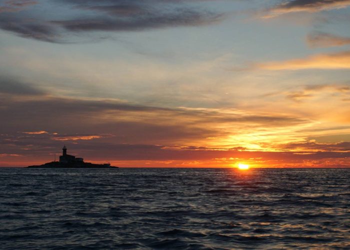 Join us on this dreamy sunset boat trip and try to spot some dolphins! We depart from Valdibora and start our evening with a panorama tour. While passing the Rovinj Island, you will have gorgeous views of the city. As we go further out on the sea, we will pass some picturesque islands, so you can enjoy the view while sipping on a drink. After the panoramic tour, we will head towards an area where we can see dolphins. The dolphins are wild animals that move around depending on the weather and the time of year, but our professional skipper knows exactly where to find them, so keep your cameras ready! When the sun reaches the horizon, we will start our way back to Rovinj. The sea and sky will turn into a gorgeous colour palette that will take your breath away!